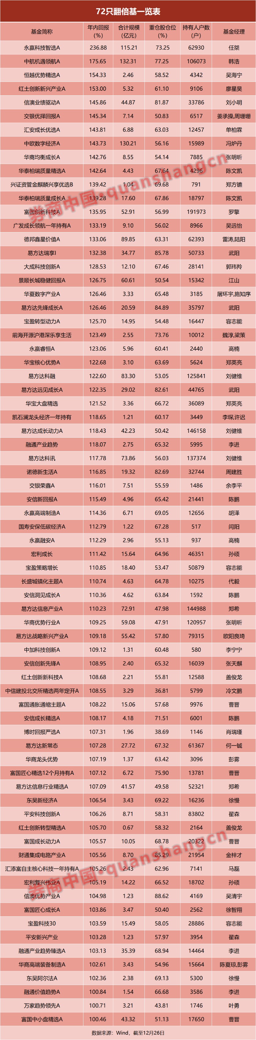 截至12月26日,公募主动权益基金年内最高收益达到236.88%,不仅锁定年度冠军位置,还刷新纪录,成为公募史上收益最高的年度翻倍基。包括该基金在内,年内收益超100%的翻倍基已达72只。
